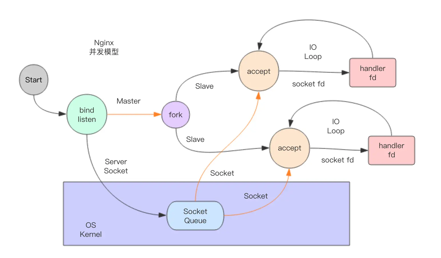 我们知道 Nginx 的并发模型是一个多进程并发模型,它的 Master 进程在绑定监听地址端口后 fork 出了多个 Slave 进程共同竞争处理这个服务端套接字接收到的很多客户端连接。