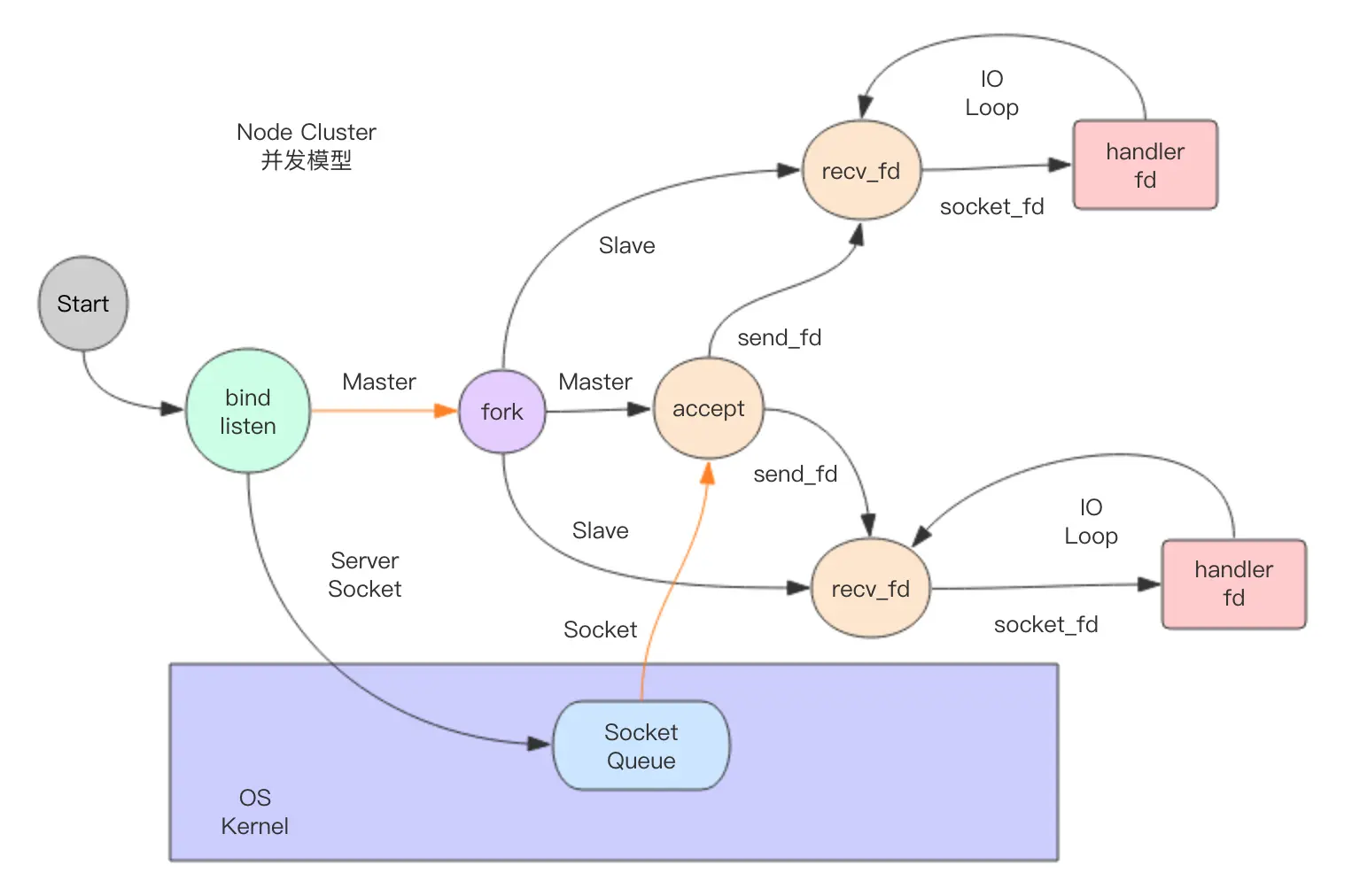 Node Cluster 为了解决负载均衡问题,它采用了不同的策略。它也是多进程并发模型,Master 进程会 fork 出多个子进程来处理客户端套接字。但是不存在竞争问题,因为负责 accept 套接字的只能是 Master 进程,Slave 进程只负责处理客户端套接字请求。那就存在一个问题,Master 进程拿到的客户端套接字如何传递给 Slave 进程。
