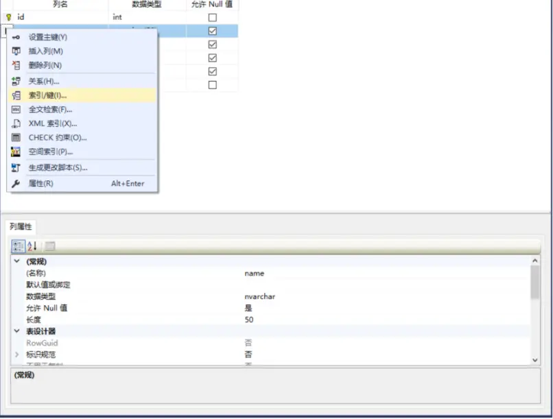 2、在表设计窗口中-》选择要添加约束的数据列-》右键点击-》选择索引/键。