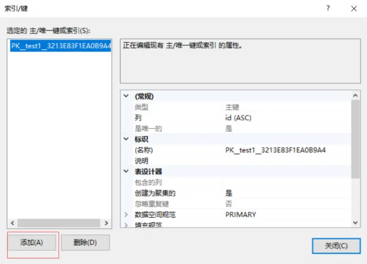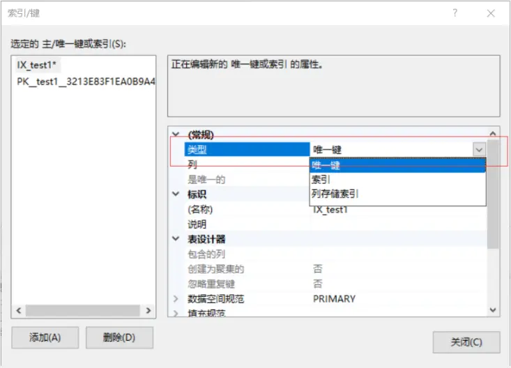 4、选择新增的索引/键-》在常规窗口中-》类型选择唯一键。