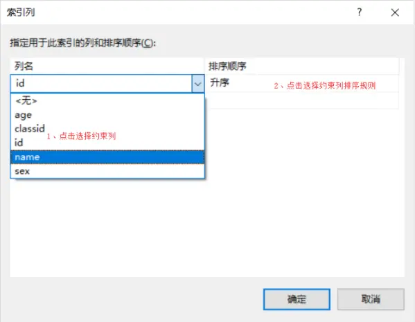 6、在索引列窗口中-》先选择约束列-》然后选择约束列排序规则-》点击确定。
