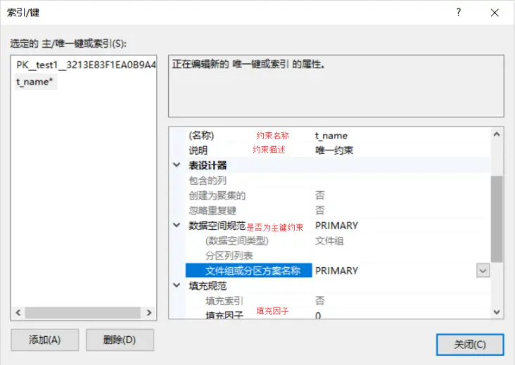 7、在索引/键弹出框中常规窗口中-》在名称中输入约束名称-》在说明中输入约束描述-》其他可以选择默认-》点击关闭。