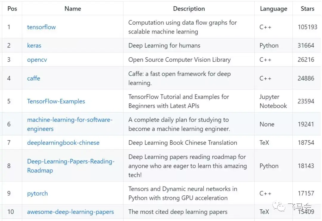 谷歌的 TensorFlow 排名第一,可以说是意料之中,第二名是 keras,Keras 是一个极简的、高度模块化的神经网络库,我们先来详细看一下前十的项目