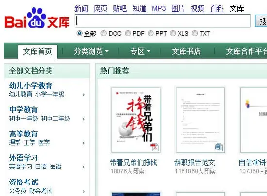 利用文库向用户展现信息、品牌布局、长尾词排名的推广方式称为文库推广,目前主流的文库有百度文库、豆丁文库、道客巴巴等,其中百度文库市场占有率最大,最受推广者欢迎。