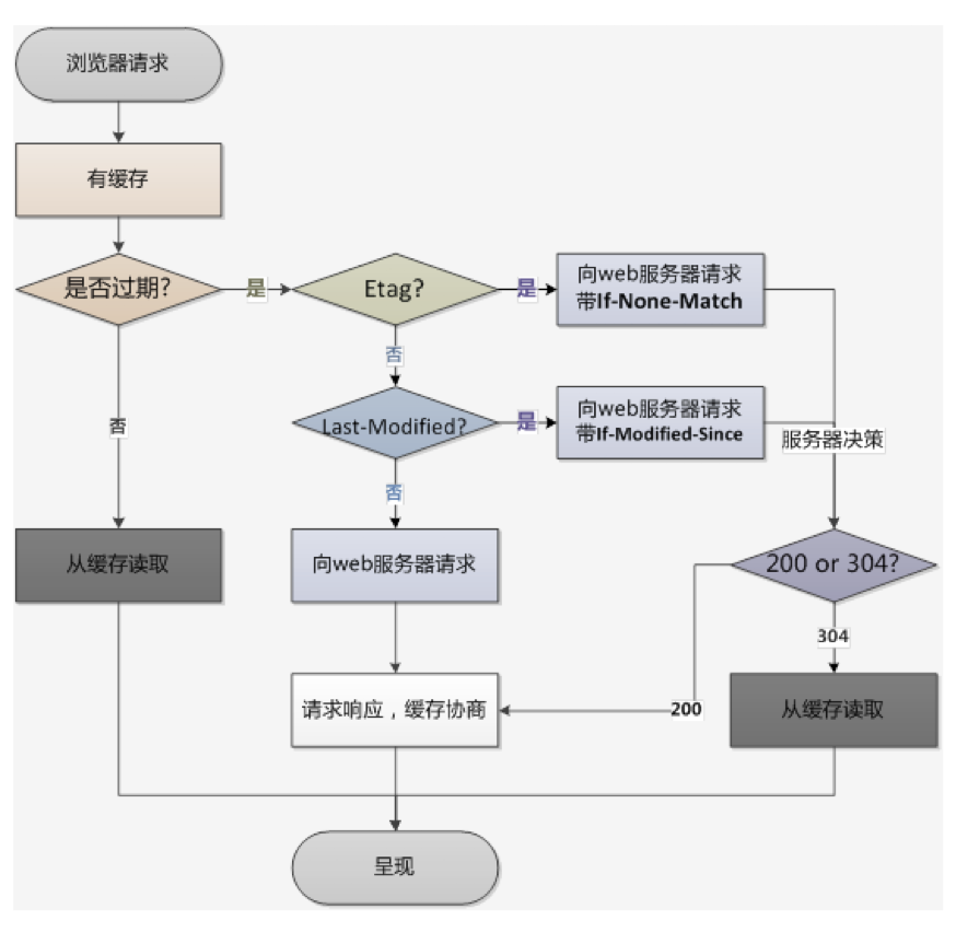浏览器请求 -> 无缓存 -> 向web服务器请求 -> 请求响应,缓存协商 -> 呈现