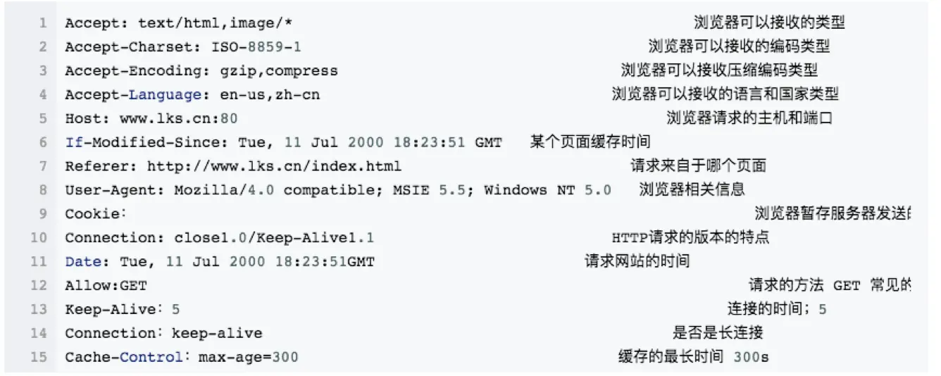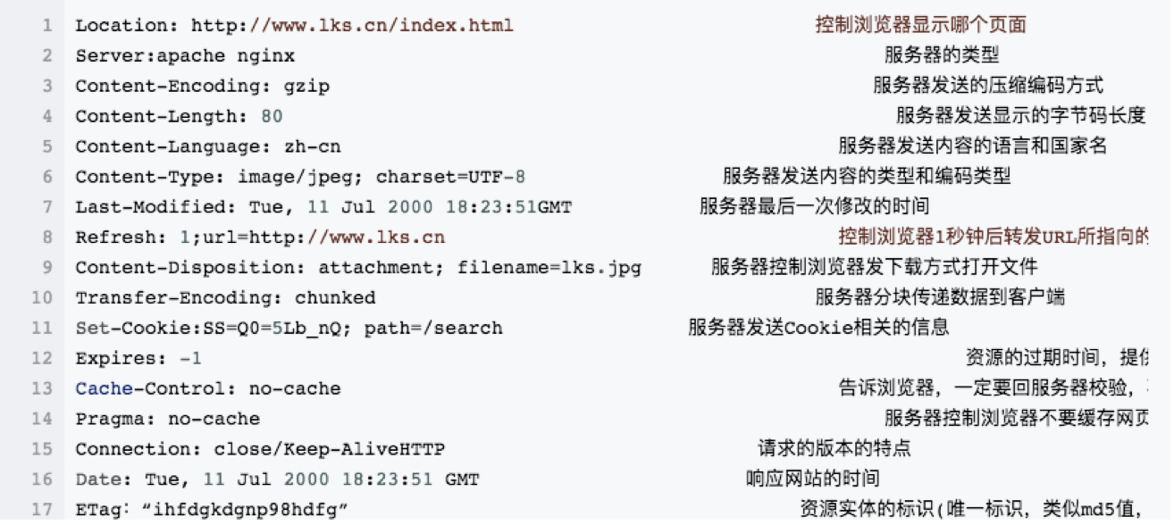 响应头:服务器向浏览器相应数据,告诉浏览器我是谁,我要怎么做。如,我是nginx,给你的资源是正确的200 还是错误的404,我告诉你需要缓存多久。