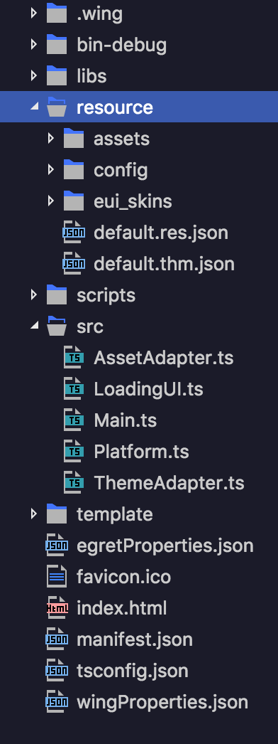 你可以快速浏览一遍官方教程,以便更好对下文有所理解,developer.egret.com/cn/github/e… 。 文章不是教程所以会省略掉那些白鹭官网里的教程。 现在我们使用egret launcher创建一个初始化项目,初始化后的文件结构如下图,我展开了resource和src文件夹,因为我们需要操作的主要是这两个文件夹,resource文件夹主要是存放静态资源,我们的代码都在src里,白鹭使用的是typescript。