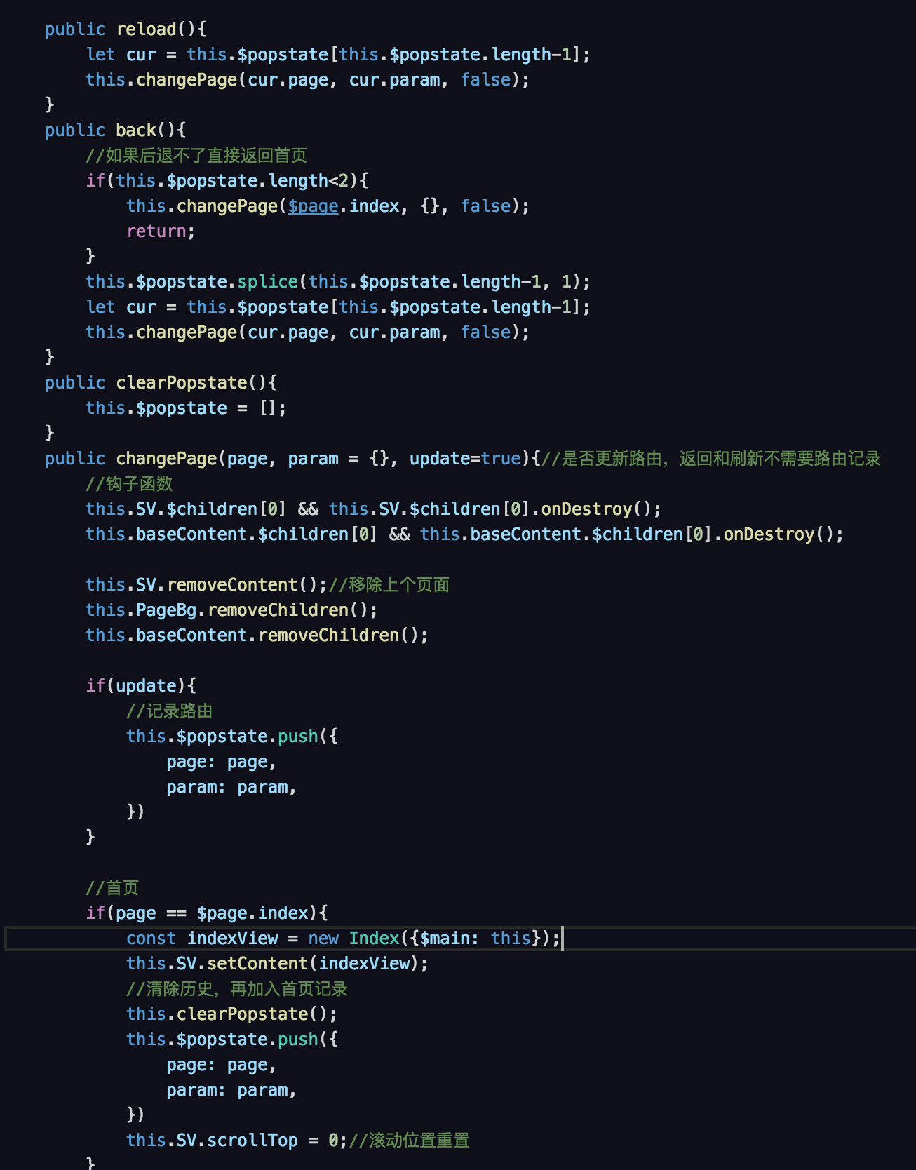 基层容器准备好以后,我们可以创建一个首页页面。 我会创建3个文件:base.ts,Index_ui.ts,Index.ts。 Index继承Index_ui,Index_ui继承base。 所有的_ui都会继承base,base会定义通用方法和属性。 因为一个页面到最后可能代码量会比较大,甚至比较乱,所以才把一个页面拆分成page和page_ui,_ui里写视图相关代码,page里调用_ui的方法、处理请求和编写逻辑,达到视图和逻辑分离的效果。 当首页写好以后,需要创建一个简易路由,用路由提供的方法把Index添加到SV容器中。 我把路由直接写到了main中,changePage就是页面切换的方法,代码大致如下: