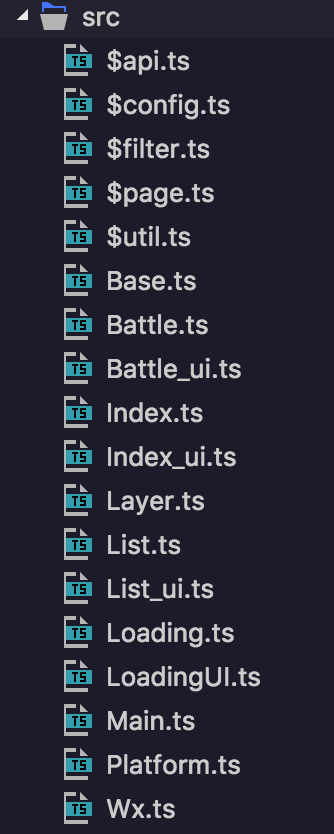 一个简易的开发封装的核心代码已经搭建好了,而后我们还需要封装一些其它工具类,如下图:配置文件($config)、封装拦截器($api)、滤镜($filter)、工具函数($util)、微信api封装(Wx)。 Platform.ts是白鹭自动生成的文件,根据它的规则自己写了一个Wx.ts文件,由于不同平台的接口形式各有不同,白鹭推荐开发者通过这种方式封装平台逻辑,以保证整体结构的稳定,白鹭推荐开发者将所有接口封装为基于 Promise 的异步形式。