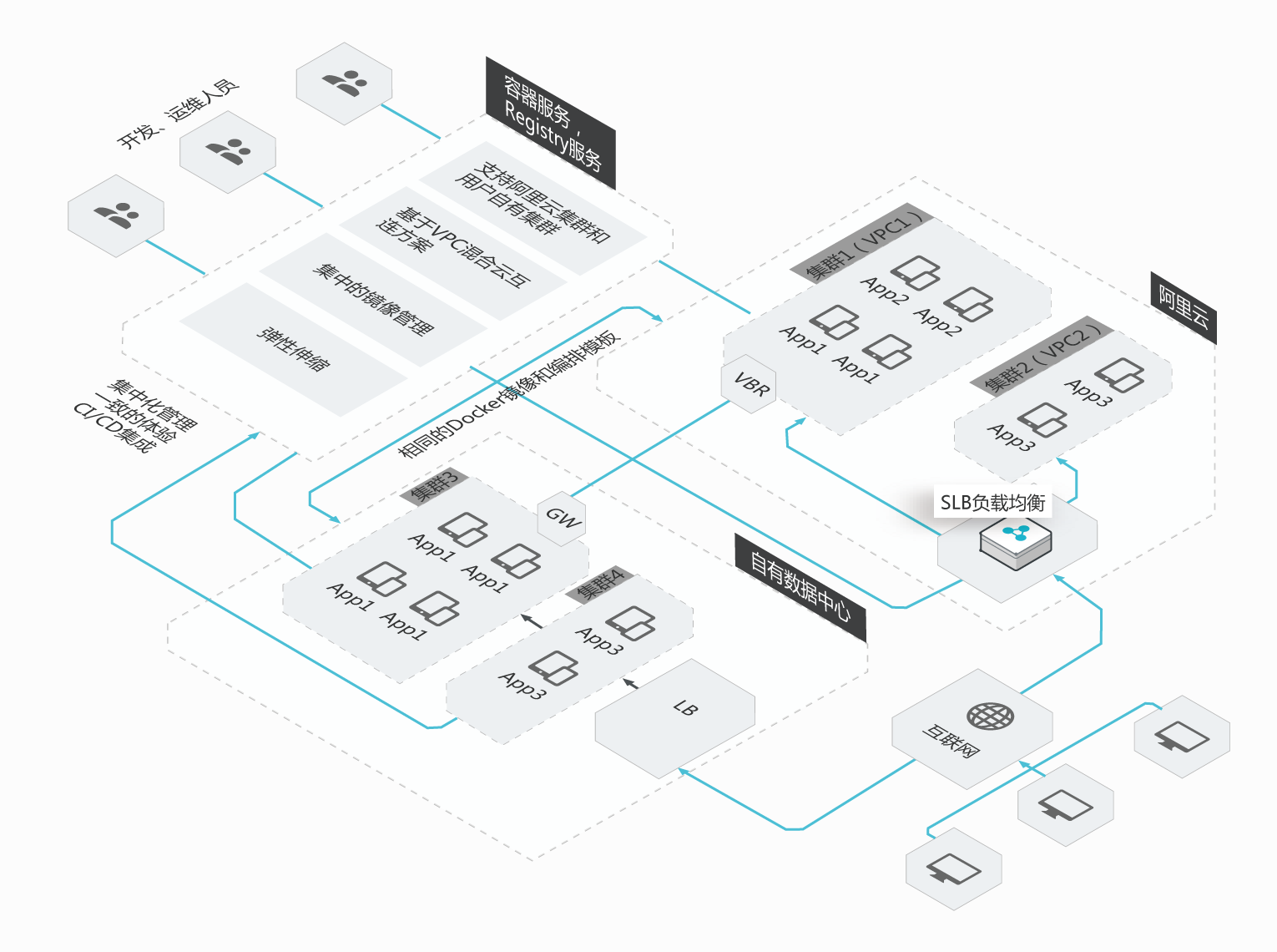 在容器服务控制台上同时管理云上云下的资源,不需在多种云管理控制台中反复切换。基于容器基础设施无关的特性,使用同一套镜像和编排同时在云上云下部署应用。