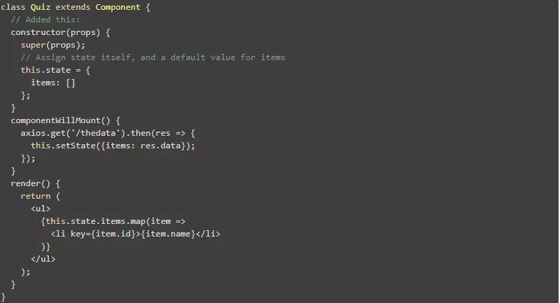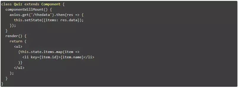 二是当通过异步的方式获取数据时,无论是在构造函数中 componentWillMount 中,还是在构造函数中提取 componentDidMount,组件在数据加载之前至少会渲染一次。当检测首次渲染时,会发现 this.state.items 是未定义的。此时就会出现一个错误 -“Uncaught TypeError: Cannot read property ‘map’ of undefined" in the consol”。