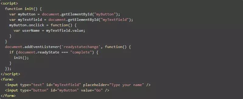 在这个例子中,我们可以通过添加一个事件侦听器来解决这个问题,事件侦听器会在页面准备就绪时通知我们。一旦 addEventListener 被触发,该 init( ) 方法就可以使用 DOM 元素。