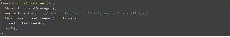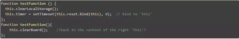 执行上面的代码会导致以下错误:“Uncaught TypeError: undefined is not a function。” 发生以上错误的原因是,当你调用 setTimeout( ) 时,实际上是在调用 window.setTimeout( ),传递给 setTimeout( ) 的匿名函数是在窗口对象的上下文中定义的,而该窗口对象没有 clearBoard( ) 方法。