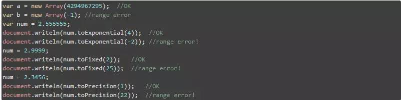 如果将值传递给超出范围的函数,也可能会发生这种情况。许多函数只接受特定范围内的数字输入值。例如,Number.toExponential( digits ) 与 Number.toFixed( digits) 接受的参数范围为从0到20,而 Number.toPrecision( digits ) 接受的数字范围为从1至21。