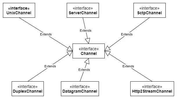总的来说,不同的协议,不同用途会对应不同类型的Channel。下面贴出Channel的接口继承图: