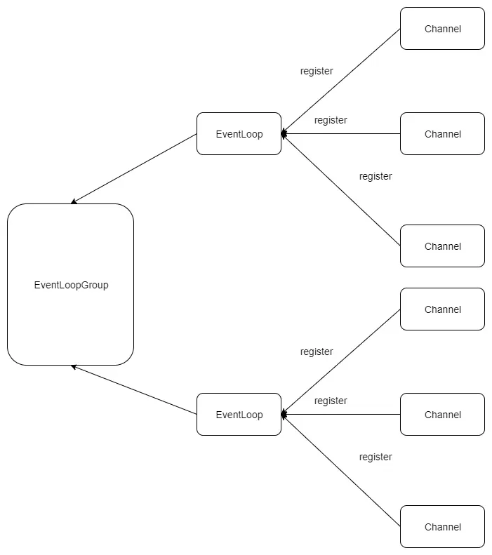 一个EventLoop是一条单纯的线程,用于处理注册在其上面的所有I/O事件,也就是说,Channel是需要注册到EventLoop上面去的,而且一个EventLoop通常会有多个Channel注册,而EventLoopGroup则是EventLoop的集合。