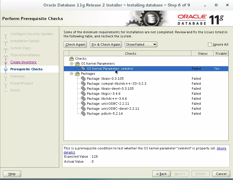 其他的一些依赖组件提示,其实我们已经大部分安装好了,只是centos7上yum安装的依赖包要比oracle 11g 所需的包更新,版本更高,所以大部分可以直接忽略这些提示(勾选 ignore all)。