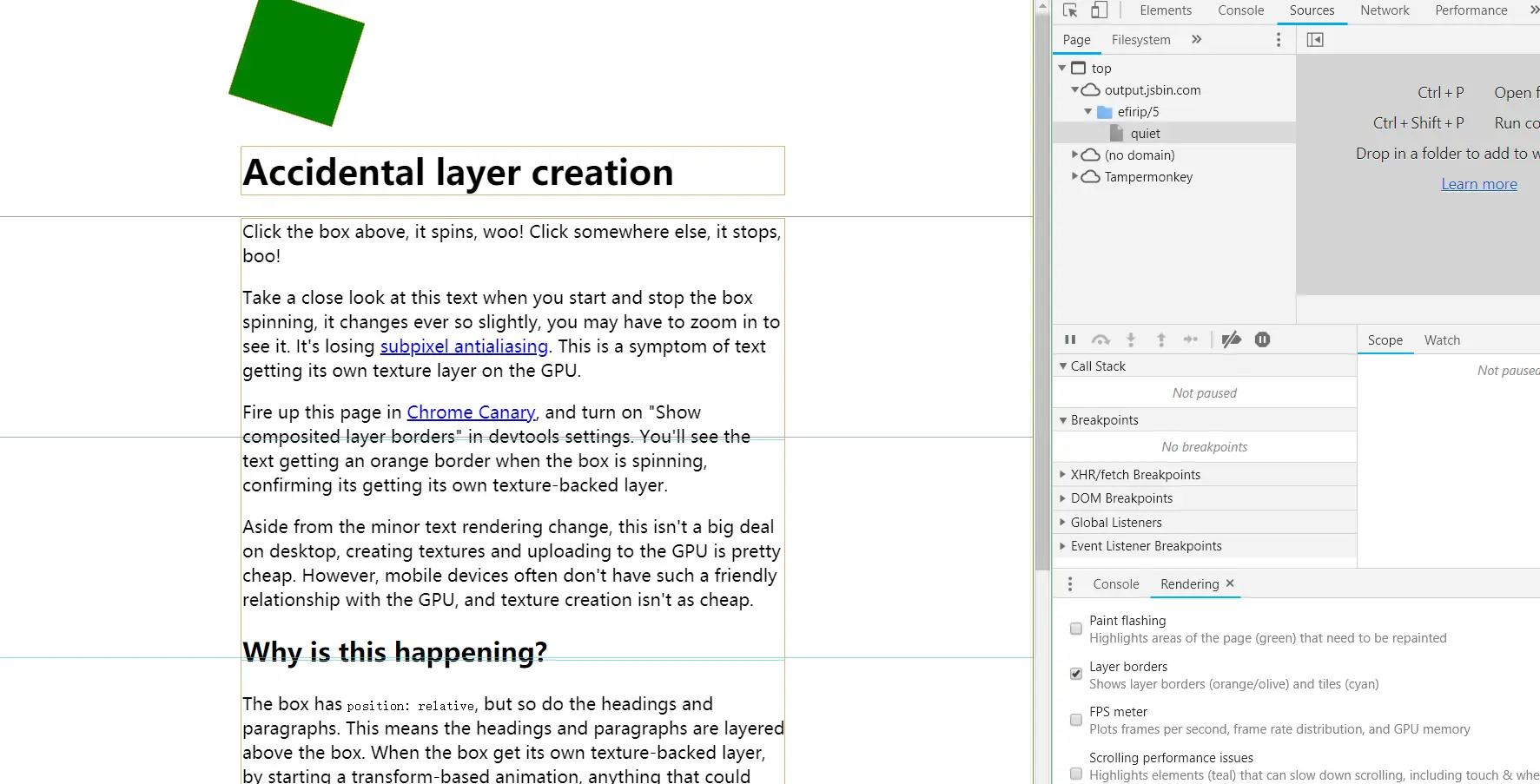优化有度,我们总能听到关于「复合层过多反而阻碍渲染」的讨论。因为浏览器已经为优化做了能做的一切, will-change 的性能优化方案本身对资源要求很高。如果浏览器持续在执行某个元素的 will-change,就意味着浏览器要持续对这个元素的进行优化,性能消耗造成页面卡顿。