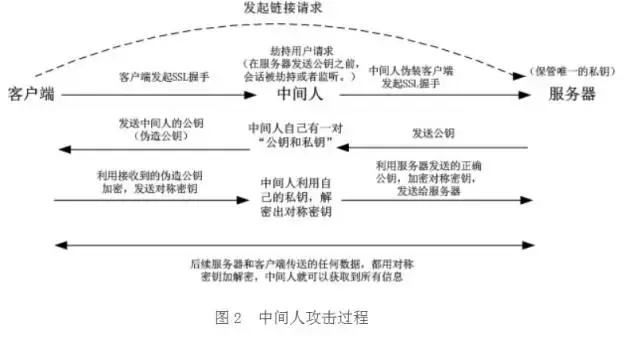 但是如果在通信过程中,在三次握手或者客户端发起HTTP请求过程中,客户端的请求被中间人劫持,那么中间人就可以伪装成“假冒客户端”和服务器通信;中间人又可以伪装成“假冒服务器”和客户端通信。如图所示。