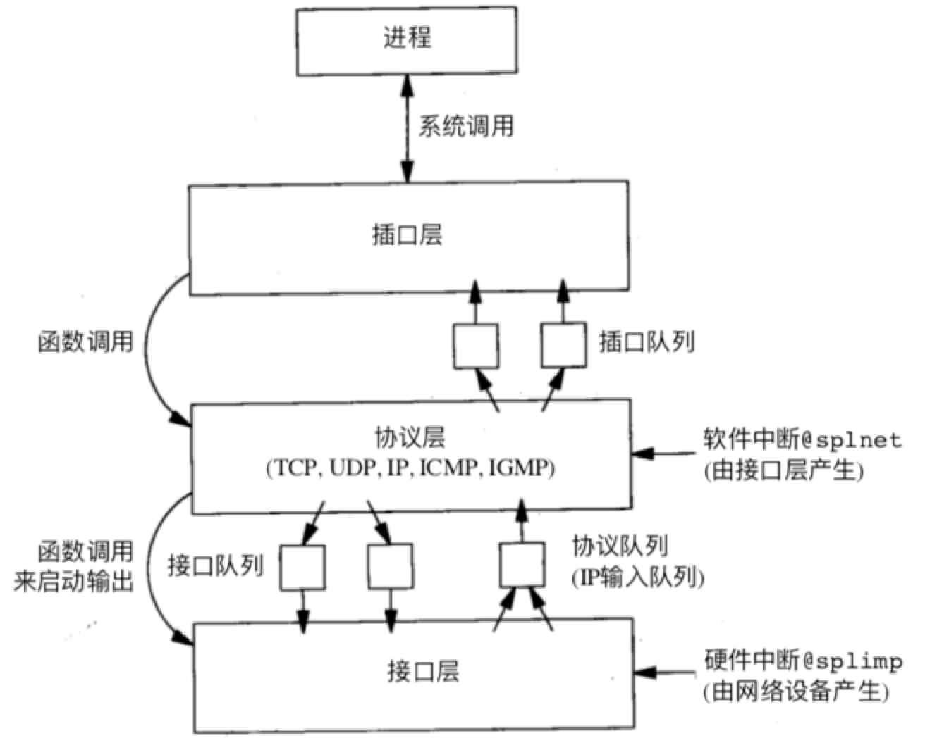 输入处理是异步的中断驱动的方式。首先,一个设备中断引发接口层代码执行,然后它产生一个软中断引发协议层代码执行。当内核完成这些级别的中断后,执行插口代码。