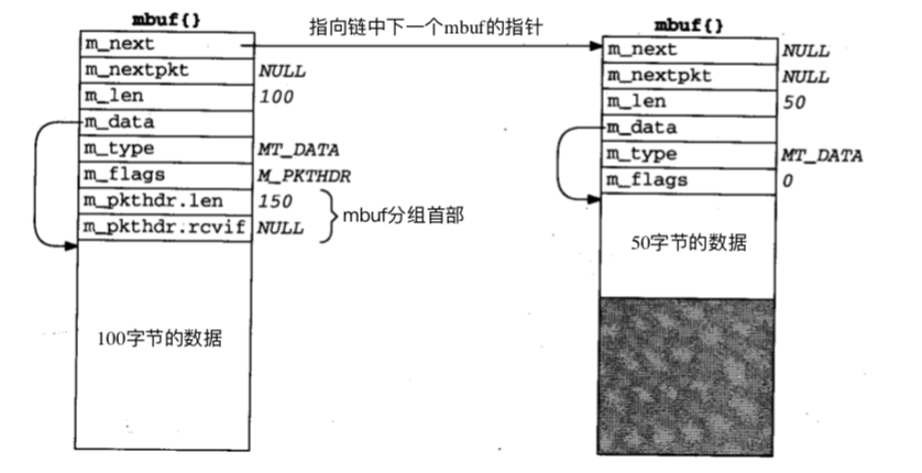图6中的结构由两个mbuf组成,通过m_next指针指向下一个mbuf,这种方式叫作mbuf链表。与图5中的mbuf最大的差别是第一个mbuf首部增加了两个成员:m_pkthdr.len和m_pkthdr.rcvif。这两个成员组成了一个分组首部并且只用在链表的第一个mbuf中。m_flags的值为M_PKTHDR,指示这个mbuf包含一个分组首部。m_pkthdr.len包含整个mbuf链中的数据总长度(本例中为150),m_pkthdr.rcvif包含了一个指向接收分组的接收接口结构的指针。