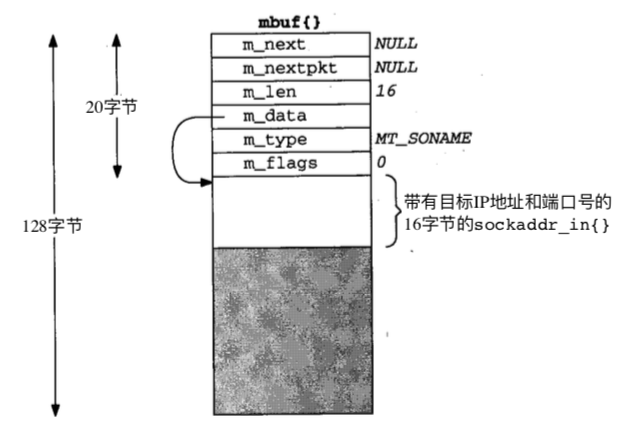 m_next和m_nextpkt用于将多个mbuf连接起来;m_data指向mbuf中的数据,本例中数据为插口地址(sockaddr_in{}),m_len指示它的长度;m_type指示mbuf中的数据类型,本例中为MT_SONAME(插口名称),m_flags为标志位。