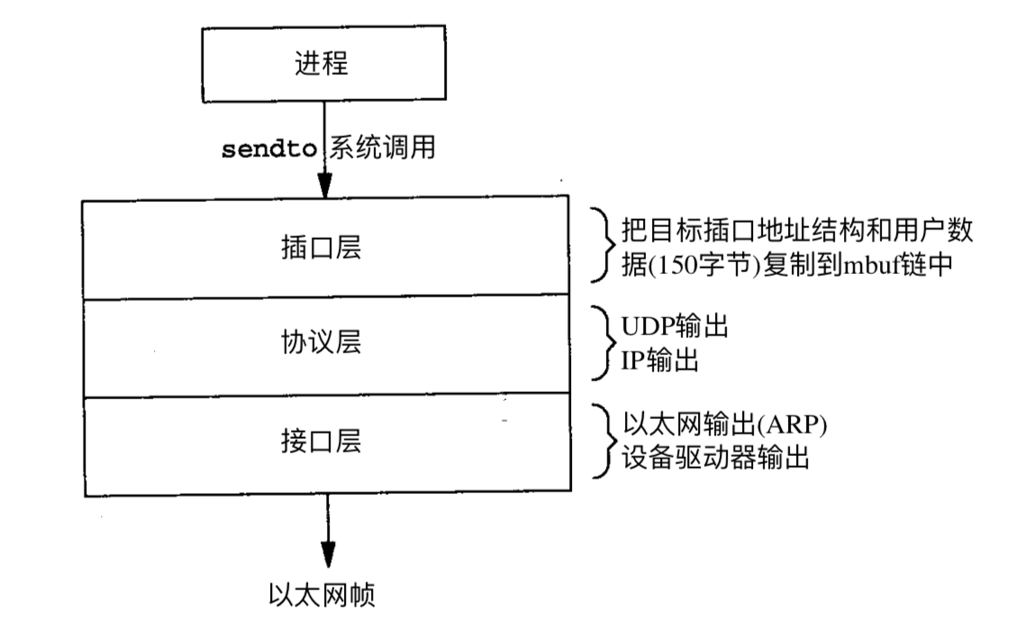 在插口层,通常将目标插口地址结构复制到一个mbuf中,并把数据复制到mbu链中,然后与此插口描述符对应的协议层被调用。明确地说,UDP输出例程被调用,指向mbuf的指针被作为一个参数传递。这个例程在这150个字节数据前添加一个IP首部和一个UDP首部,然后将这个mbuf链传递给IP输出例程。