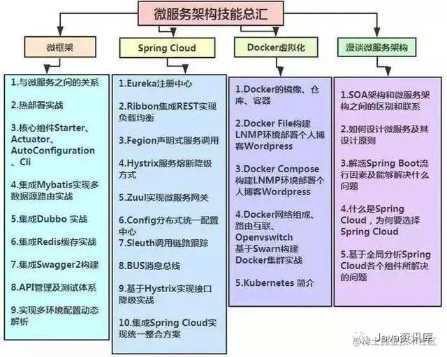 微服务架构解决了传统单体式架构的弊端,但其实施的本身面临很多陷阱和挑战,涉及到设计、开发、测试、部署、运行和运维等各个方面,一旦使用不当,则会导致整个微服务架构改造的效果大打折扣,甚至失败。对于这些问题,我总结出微服务需要学习的知识点,如下图所示: