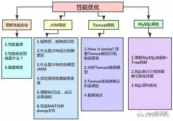 必须要明白的是:没有两个应用程序可以使用相同的优化方式,也没有完美的优化 java 应用程序的参考路径,,坚持采用适当的方式处理性能优化。想要达到最高的性能优化,作为一个 Java 开发人员,需要对 Java 虚拟机(JVM)和底层操作系统有正确的理解。而在此之前要理解性能优化的知识体系,如下图所示: