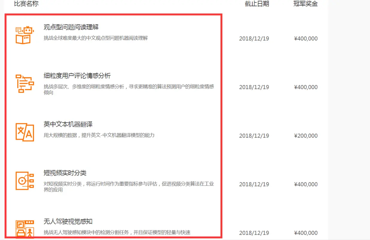 随着近几年人工智能和大数据的快速发展和应用,使得相应的工智能&大数据相关比赛比赛近几年火热了起来,下面就我知道到的人工智能&大数据相关比赛,为大家简要说下,感兴趣的可以参加一些比赛,锻炼一下自己,也能知道一些前沿的技术,说不定还能拿些奖金呢?哈哈