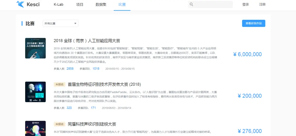 科赛(Kesci.com)是聚合数据人才和行业问题的在线社区。科赛打造的 K-Lab 在线数据分析协作平台,为数据工作者的学习和工作带来全新的体验。 比赛有简单,有难,有些有奖金,有些没有,可能知名度没有前几个高