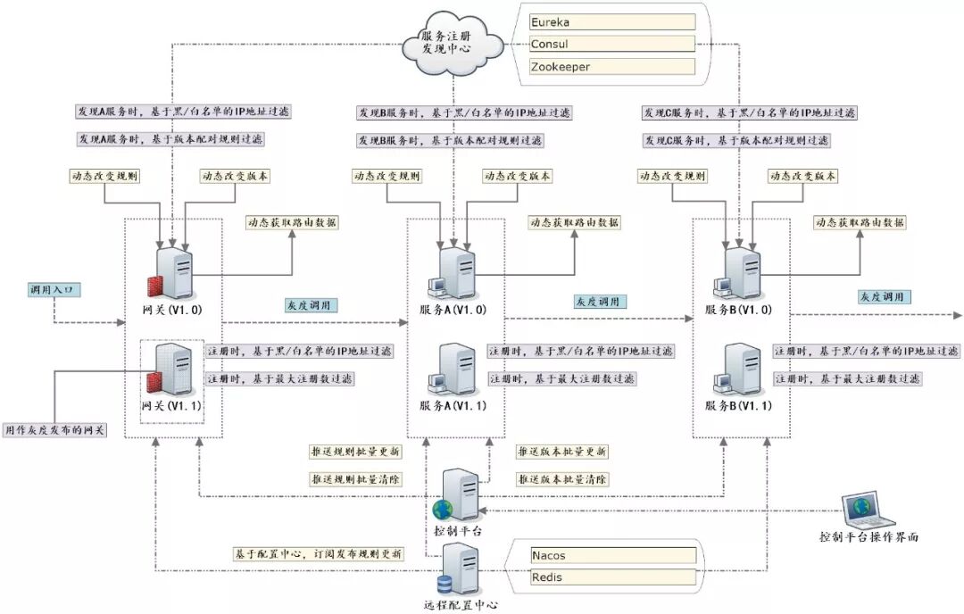 黑/白名单的IP地址注册的过滤 开发环境的本地微服务(例如IP地址为172.16.0.8)不希望被注册到测试环境的服务注册发现中心,那么可以在配置中心维护一个黑/白名单的IP地址过滤(支持全局和局部的过滤)的规则。 我们可以通过提供一份黑/白名单达到该效果。 最大注册数的限制的过滤 当某个微服务注册数目已经达到上限(例如10个),那么后面起来的微服务,将再也不能注册上去。 黑/白名单的IP地址发现的过滤 开发环境的本地微服务(例如IP地址为172.16.0.8)已经注册到测试环境的服务注册发现中心,那么可以在配置中心维护一个黑/白名单的IP地址过滤(支持全局和局部的过滤)的规则,该本地微服务不会被其他测试环境的微服务所调用。 我们可以通过推送一份黑/白名单达到该效果。 多版本访问的灰度控制 A服务调用B服务,而B服务有两个实例(B1、B2),虽然三者有相同的服务名,但功能上有差异,需求是在某个时刻,A服务只能调用B1,禁止调用B2。在此场景下,我们在application.properties里为B1维护一个版本为1.0,为B2维护一个版本为1.1。 我们可以通过推送A服务调用某个版本的B服务对应关系的配置,达到某种意义上的灰度控制,改变版本的时候,我们只需要再次推送即可。 多版本权重的灰度控制 上述场景中,我们也可以通过配对不同版本的权重(流量比例),根据需求,A访问B的流量在B1和B2进行调拨。 多数据源的数据库灰度控制 我们事先为微服务配置多套数据源,通过灰度发布实时切换数据源。 动态改变微服务版本 在A/B测试中,通过动态改变版本,不重启微服务,达到访问版本的路径改变。 用户自定义和编程灰度路由策略,可以通过非常简单编程达到如下效果: