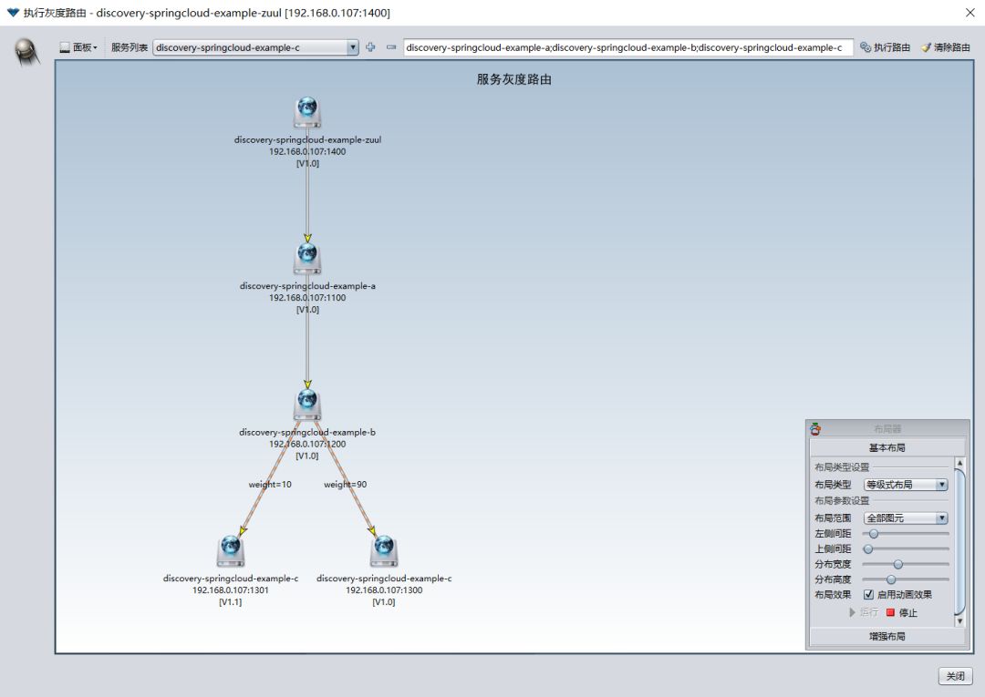 表示消费端服务a访问提供端服务b的时候,提供端服务b的1.0版本提供90%的权重流量,1.1版本提供10%的权重流量。