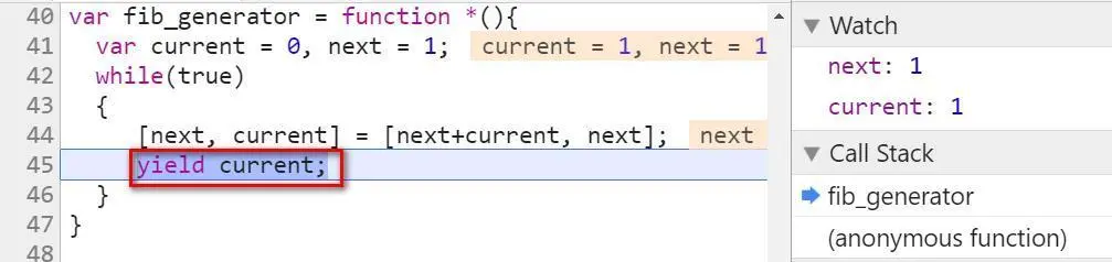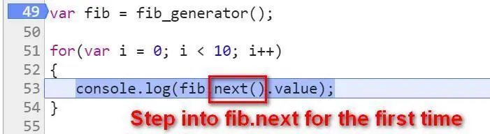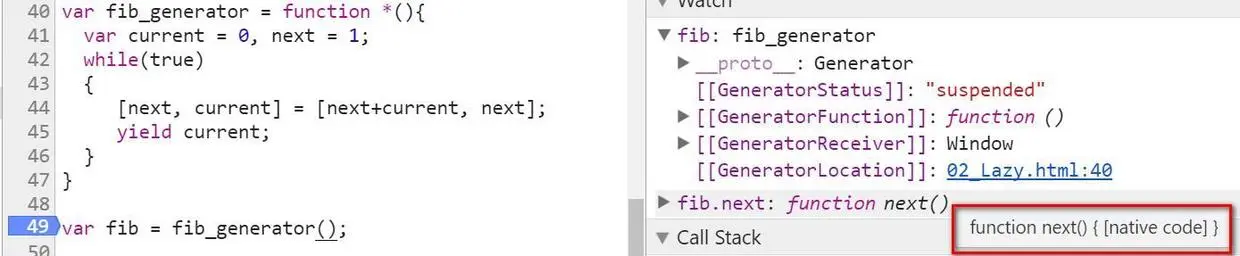 第49行,我们用()调用了这个generator,将结果存储在变量fib里。直到此时,function generator的实现体,即代码41~45行还没有得到执行。