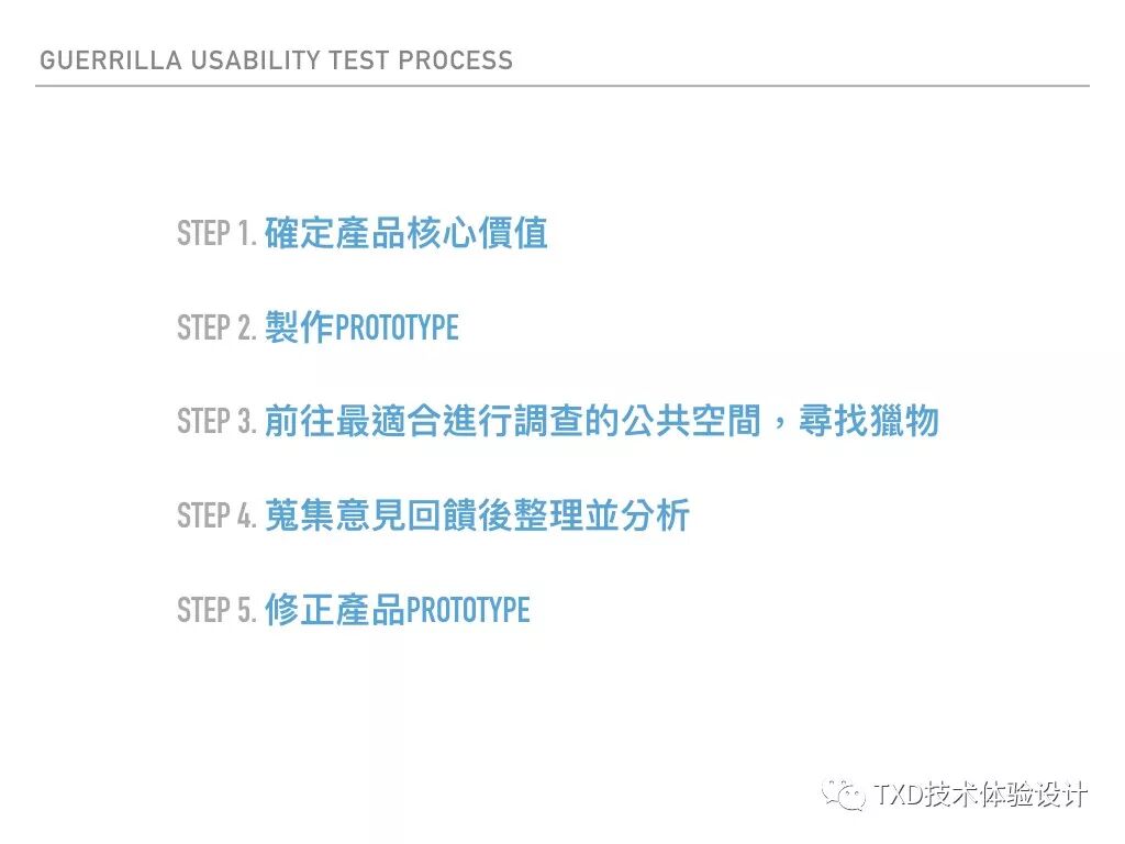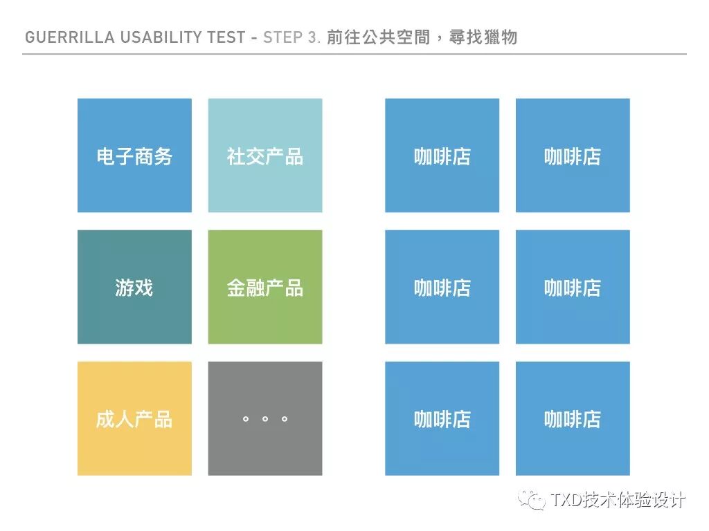 一般而已我们会明确知道用户群体的大致出没位置,例如电商用户即适合在shopping mall附近寻找,若为用户群体为学生可至学区附近。然田野调查需考量的种种因素容易造成阻碍,其实你也能找到一间咖啡店,通常游击测试需要得到的反馈,咖啡店的群体即可满足你的需求。当然,若在测试的过程中发现群体或是方法已产生用研的阻碍,必须及时调整或是采取其他方式。
