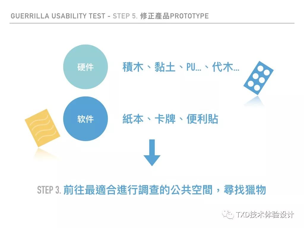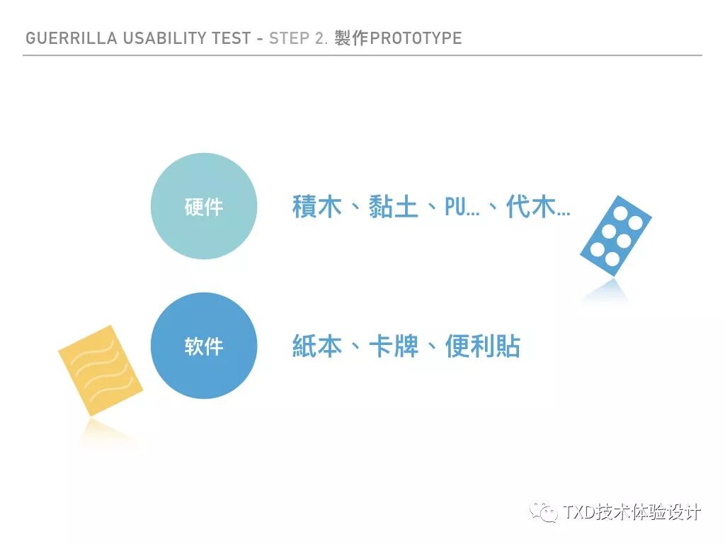在游击测试中如同前言所提到,追求的是高效实现,Centre for User Experience Research(CUO)的研究指出,高真实度和低真实度的prototype测试,对核心价值、功能验证并无明显的差异,因此采用低保真原型即可。若为硬件可用积木、粘土等材质,而软件可使用便条纸、纸本等。