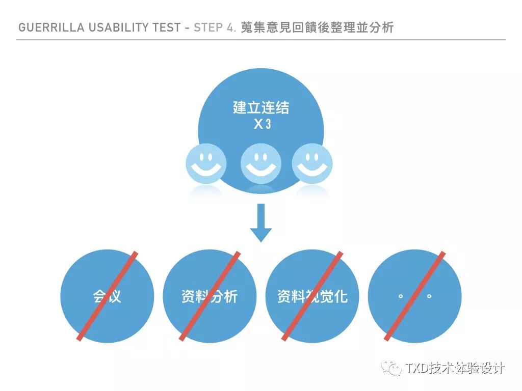 游击测试无须像一般用户访谈一样需搜集适量反馈后开始进行讯息整理并着手调整,大约与三名用户接触并获得反馈后即可“当场”修正其原型,特别要注意的点是,无须进行小组讨论、无须讲资料进行严谨分析,无须将资料视觉化。