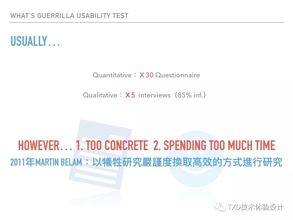 相较于一般问卷或是访谈法等等,我们知道一些严谨的定律如:五个访谈者方可得到85%的资讯,30份问卷方可达到量化的标准依据等等限制。然而这样的限制于游击测试的概念相比已过于聚焦,并且耗时。自2011年Martin