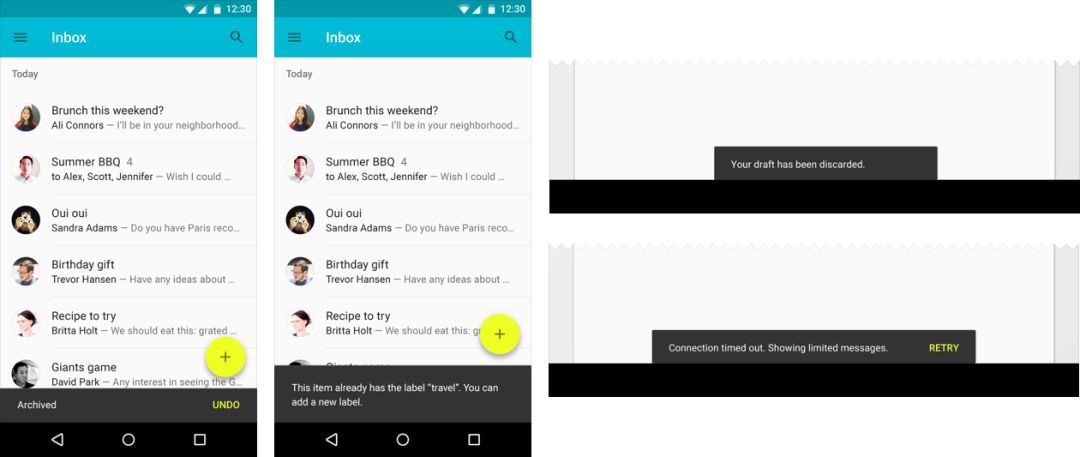 既然提到了Toast,那就不得不再提一下,安卓特有的另一种交互弹窗:Snackbar。详细的分析可见 @龙爪槐守望者 的文章,写得非常清晰:《「这个控件叫什么」系列之TOAST(吐司提示)的曾经、现在与未来》