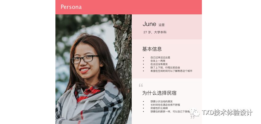 首先是通过自己的「产品定位」以及「项目需求」来描绘了一个目标用户的用户画像(Persona )。