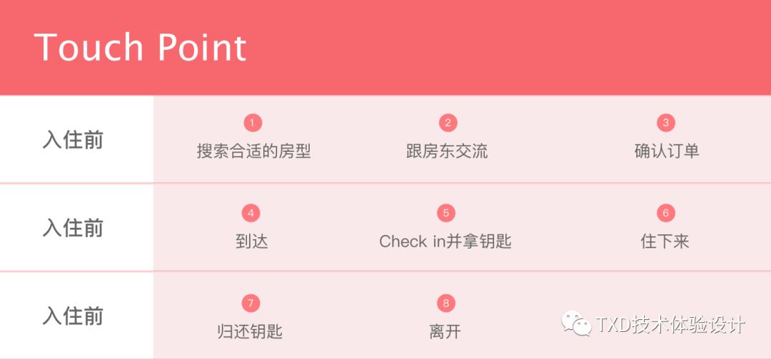 确定民宿的目标用户之后,针对这类用户他们会遍历哪些触点(Touch Point),这个过程可以分为三个阶段,「入住前」「入住」「离开」,在这三个节点中,用户会接触到很多媒介,通过自己遍历一遍,可以把关键的触点串起来。