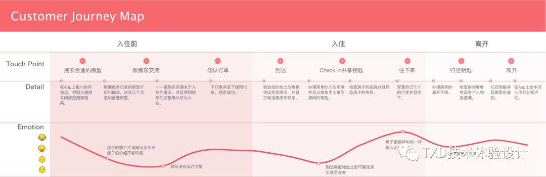 根据触点,把每个触点或触点之间的真实经历更加详细的罗列,通过亲身的模拟和用户的访谈中,可以明确知道用户在这整个过程中的情绪曲线。通过情绪曲线可以看到用户在不同的过程中,体验的差异比较大。在「入住前」用户的情绪曲线普遍偏低,在「入住」期间分别经历从低点到高点,离开的阶段曲线趋于平稳,没有经历太差的体验。