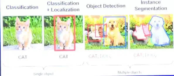 最简单的视觉识别是根据图片中的物体对图片进行分类,典型的就是判断一张照片是猫还是狗。再进一步不仅要识别图片中物体,还要对它进行定位。