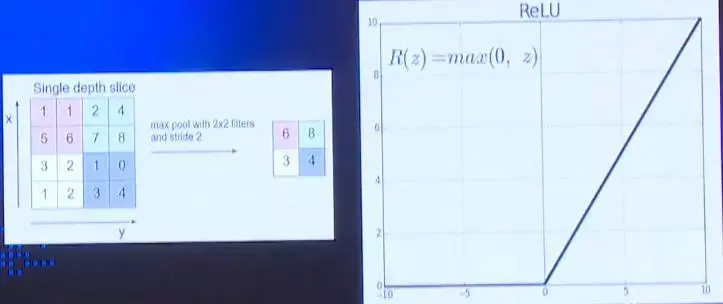 Pooling是在得到特征映射后进一步对信息进行简约化处理,如上图对某个特征映射做2*2的切分,每4个点取一个最大值,减小网络中的计算量只保留最主要的特征信息。ReLu叫做整流线性单元,它是一个激活函数,小于0的时候值一直为0,大于0的时候恢复正常。