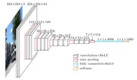 卷积神经网络衍生出过很多不同的版本,VGG16就是其中之一 ,它被很多的目标检测方案用作特征提取。VGG16接收的输入图片尺寸是224*224。图中黑色方块为一个卷积层,后面接着激活函数,红色块是石化层。卷积核得到的特征映射会逐渐缩小,越往后特征映射的点对应的原图区域越大。
