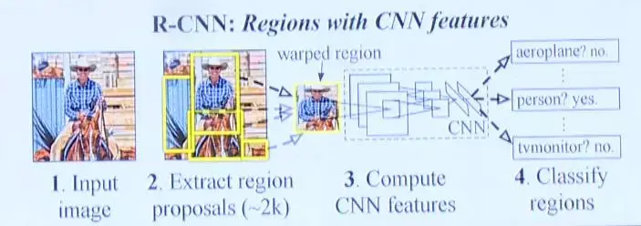 在通过提名方式大致猜测出图片中物体种类后,接下来要做的就是对这些块进行分类。这要用到卷积神经网络,更具体的是Region based CNN。输入图片后提取出region proposals,然后将这些region proposals图片缩放成统一大小的正方形输入到CNN中,最后CNN会给出分类结果。