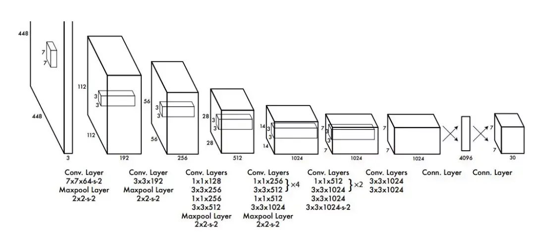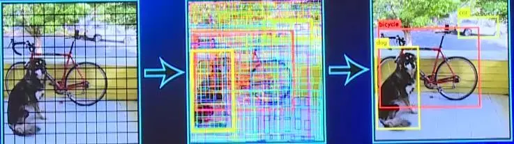所以又出现了一种新的方法——You Only Look Once。它先对图片做固定数量切分,在此基础上进行各种猜测,然后对这些猜测框进行分类以及四个角的回归,使回归和分类就融合到同一个神经网络中,实现端到端的训练。