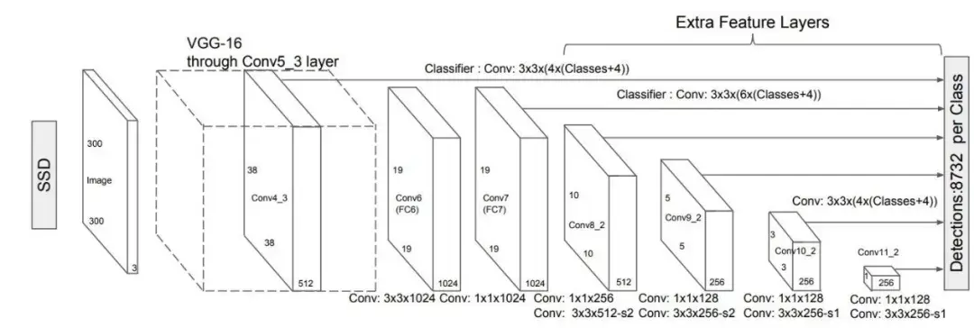 这类将区域提名以及位置和分类合并到一起的方法被称为single shot,上图是Single Shot的另一种方式multi-box detector的结构图。multi-box detector也用到了VGG16,不过仅有前三个conv_block,剔除了全链接层,原先的FC6、FC7又添加了新的卷积。可以看到其中有若干个卷积块连接到了最后的detections,也就是在不同尺度的特征映射上都进行一次物体猜测,这样精度会稍有提高,对于尺度变化较大的物体也能起到较好的效果。