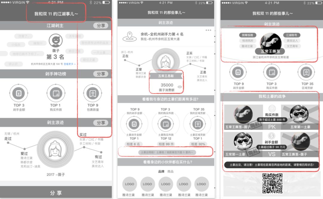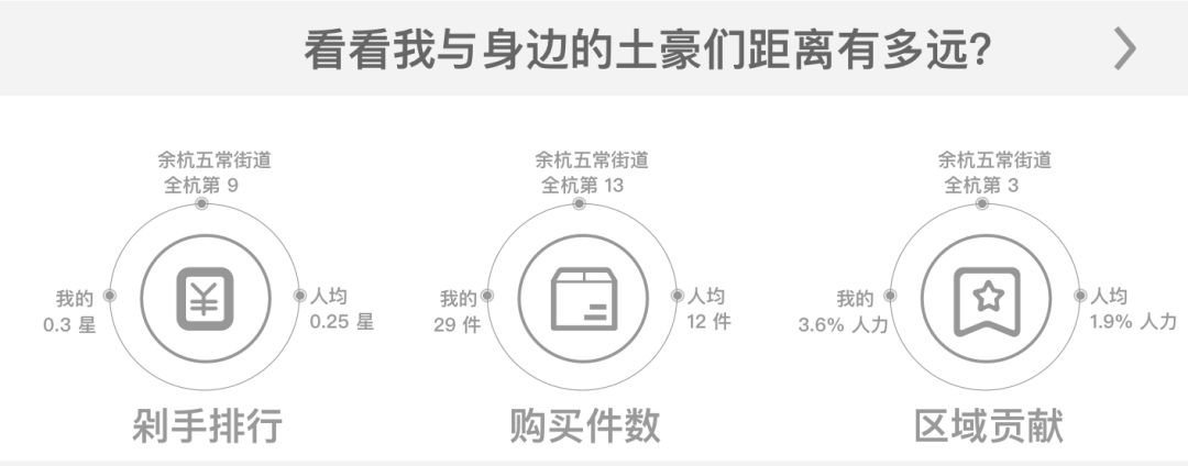 调整前是用户和上一名剁手党进行对比,例如通知用户,“您距离上一名用户剁手值相差 300 块“,考虑到此信息对用户刺激点太低,同时又要保护土豪用户的数据隐私,另一方面也为了线上线下可以进行互动趣味,我们最终确定添加土豪距离用户的物理距离,想象你在商场购物,手机突然通知你,余杭最大的土豪距离你 200M,前方高能预警,你是否会立刻警惕兴奋起来,从此擦肩的人都张了一张土豪的脸?还因为手淘大部分用户是女性用户,经调研验证,此功能点更能让她们嗨起来,因此我们保留并做了深化处理。