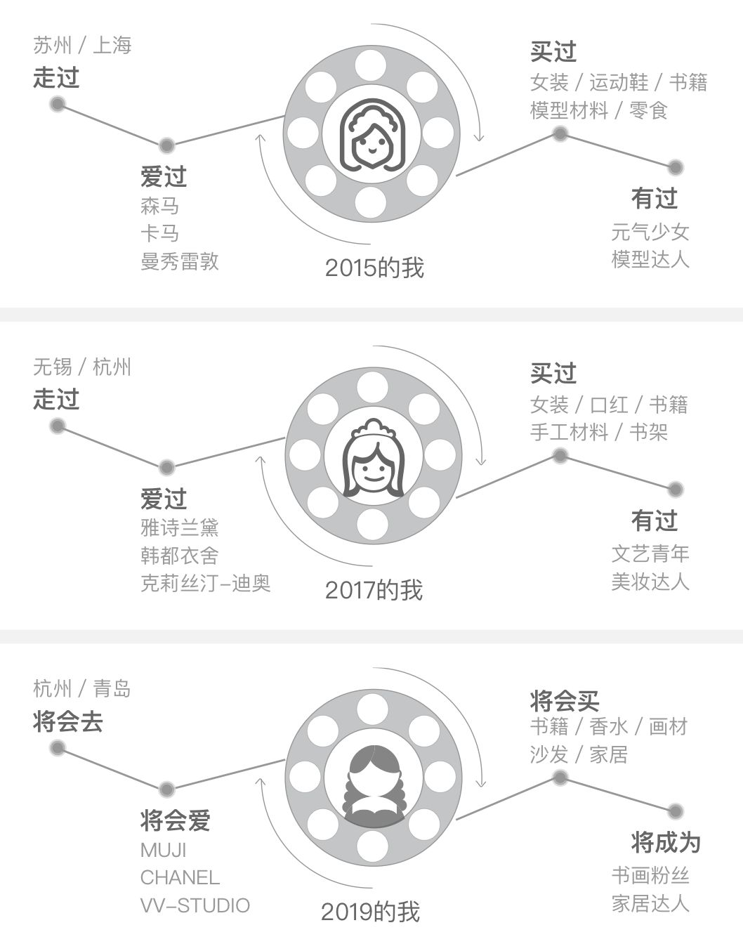 把经过的地方,喜欢过的品牌,买过的商品,个人标签称号封装在一个“时光机”的故事里,提炼成“走过”,“爱过”,“买过”,“有过”四个节点: